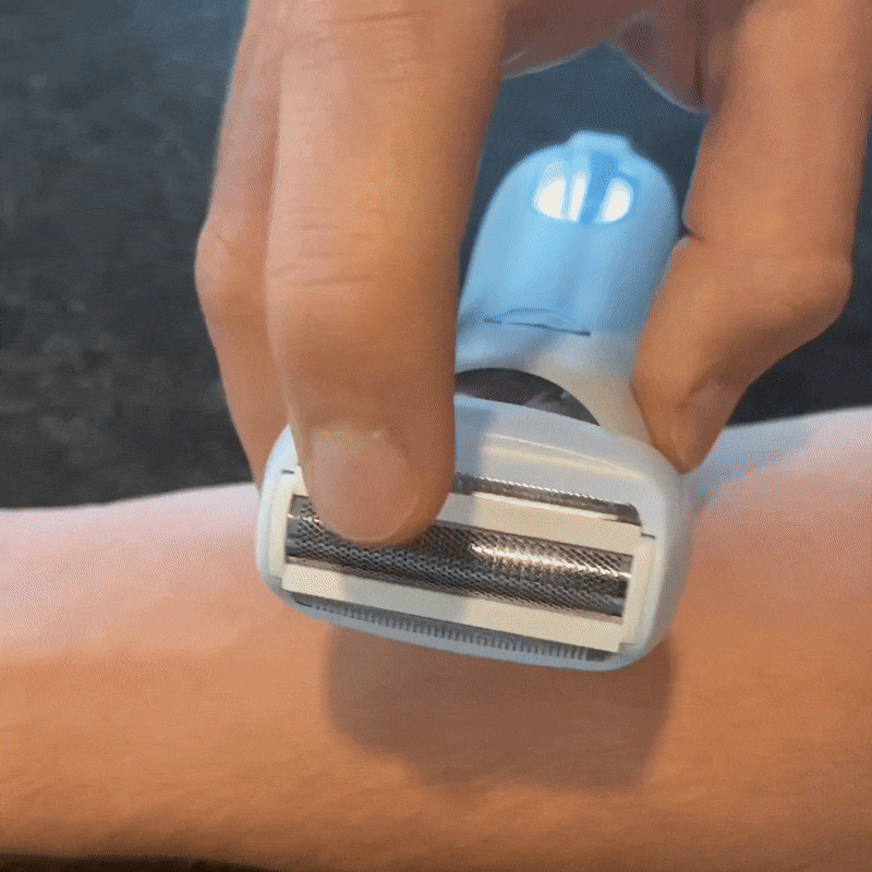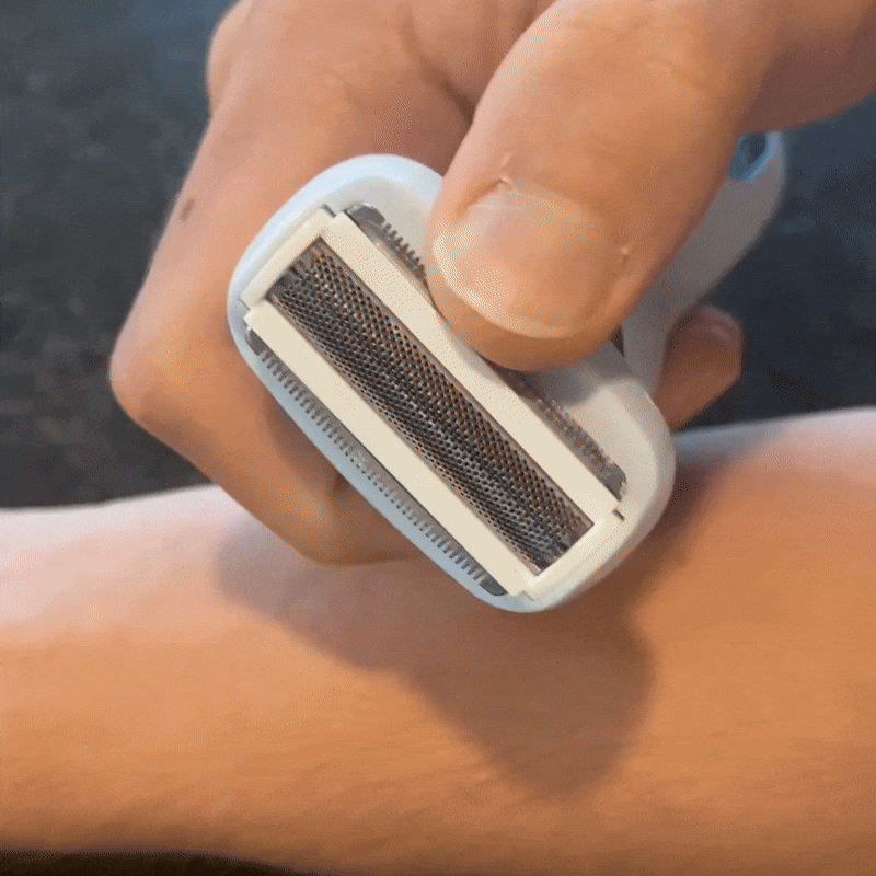 This is where the magic happens.Hold the razor verticallyagainst your skin and use the foil blade (on top) to go over thearea you just trimmed.This will remove any remaining fine hairs, leaving your skin supersmooth.